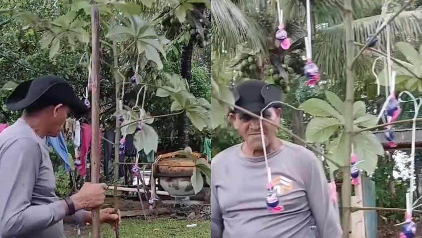 Ideia criativa do avô, que amarrou pirulitos em uma árvore do quintal para agradar o neto, conquistou milhões de visualizações nas redes sociais