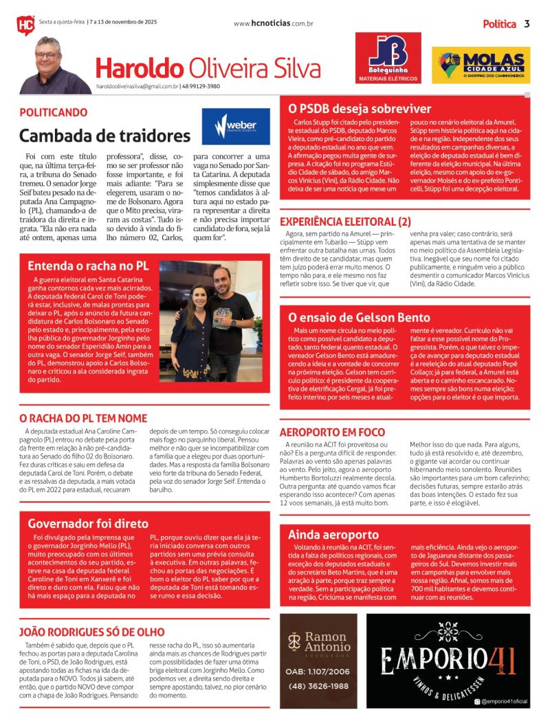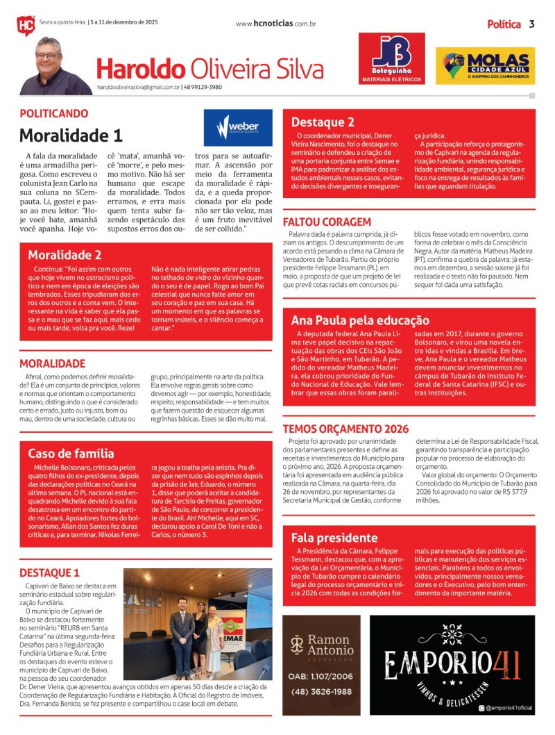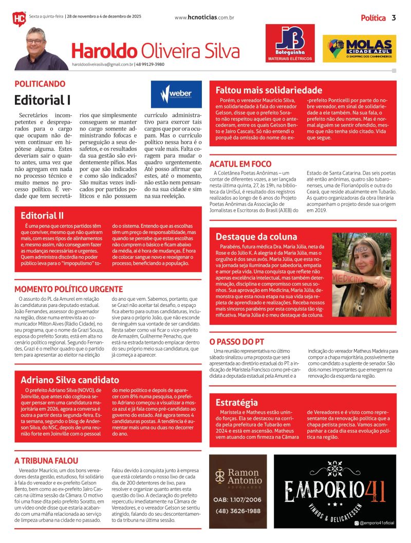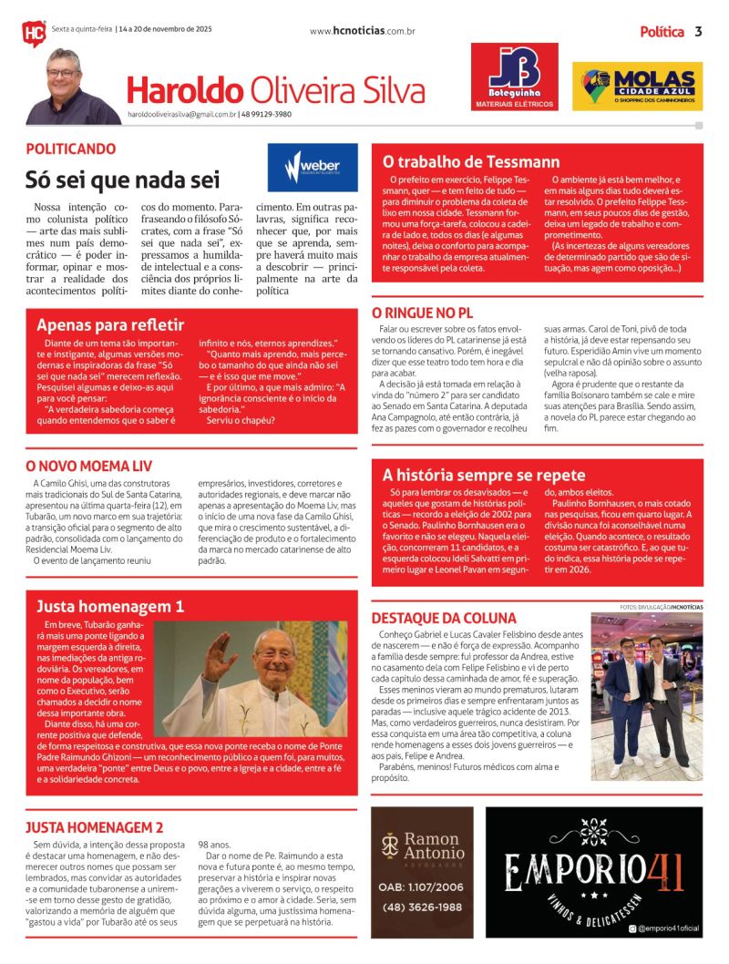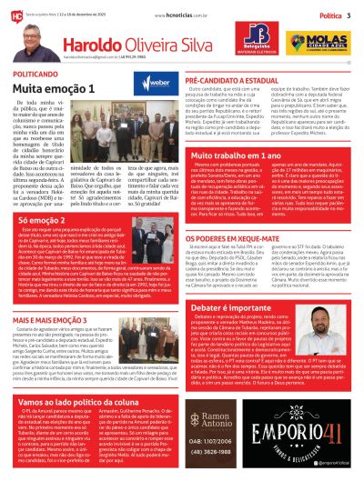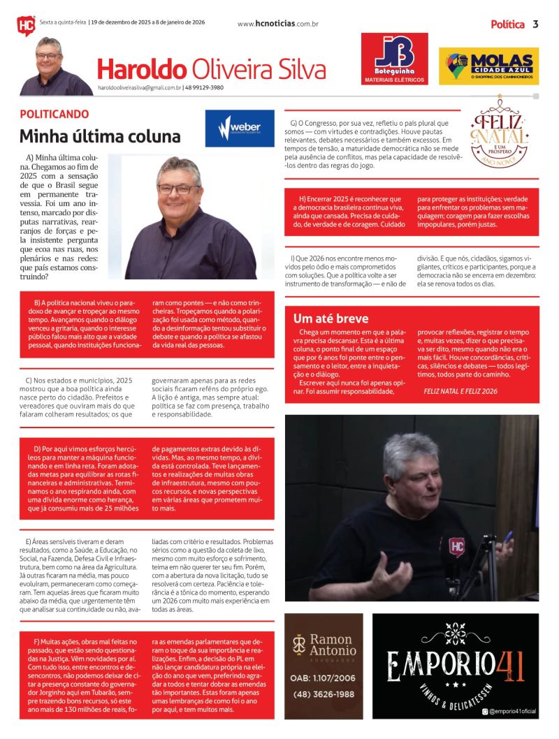 Haroldo Oliveira Silva, conhecido como “Dura”, colunista Político do HC Notícias. Semanalmente, às sextas-feiras, são publicadas suas análises sobre a política regional no nosso caderno especial. Um dos colunistas, radialistas e apresentadores mais conhecidos da região, com atuação como vereador, líder de governo, criador da Cosip, Secretário Regional e diretor da Santur, sempre teve o olhar voltado para o noticiário político, trazendo informações de relevância para a comunidade. Além de escrever para o HC, atualmente Dura é âncora do programa Frente a Frente todos os sábados pela Rádio Bandeirantes AM 1090 e também comentarista político na mesma emissora, dentro do Programa Boca no Trombone. A primeira coluna de Dura sai na edição da próxima semana, não deixe de ler!