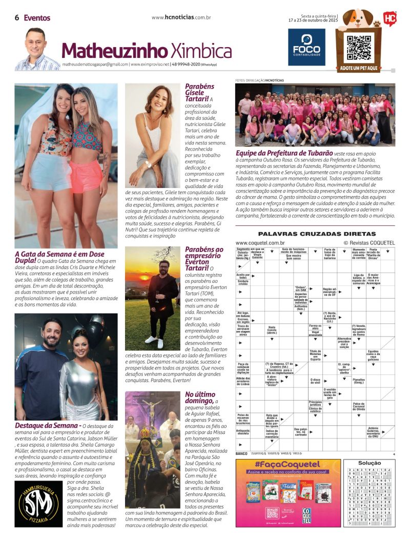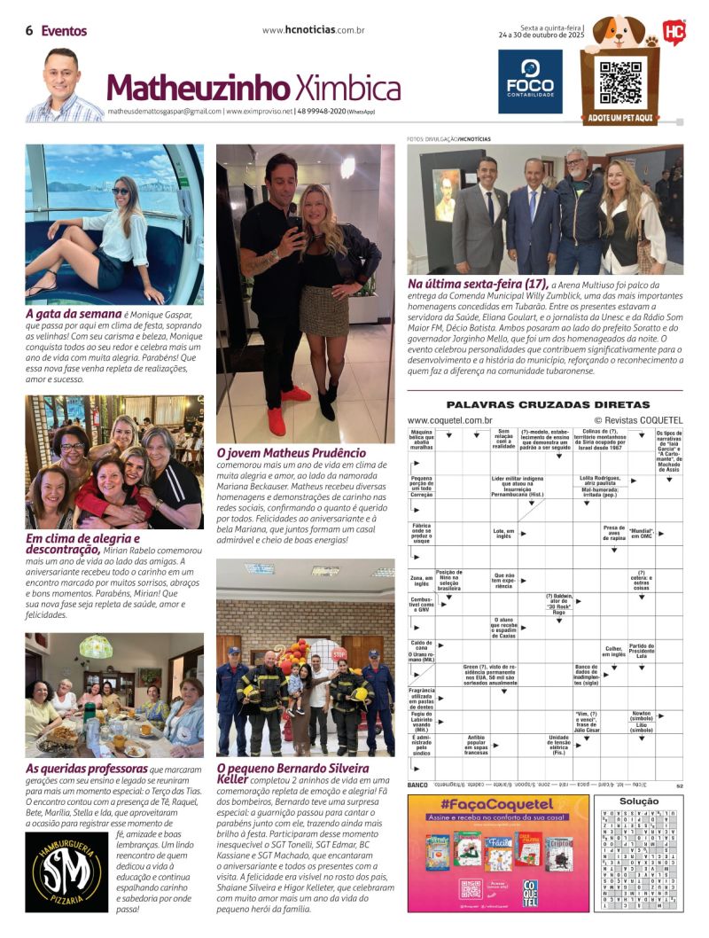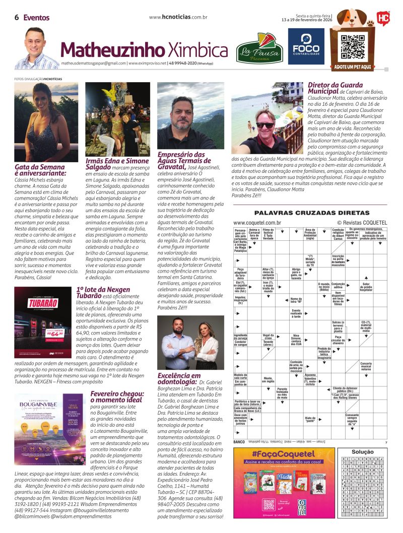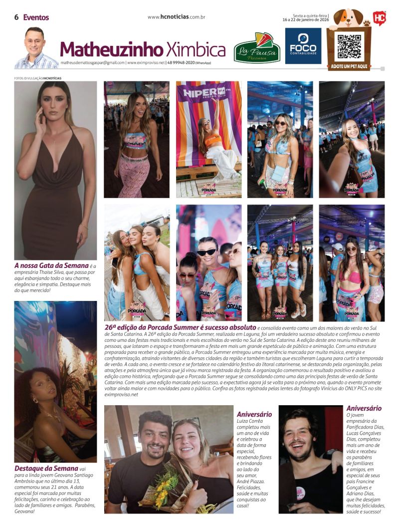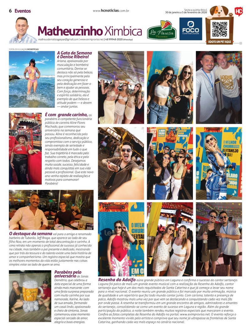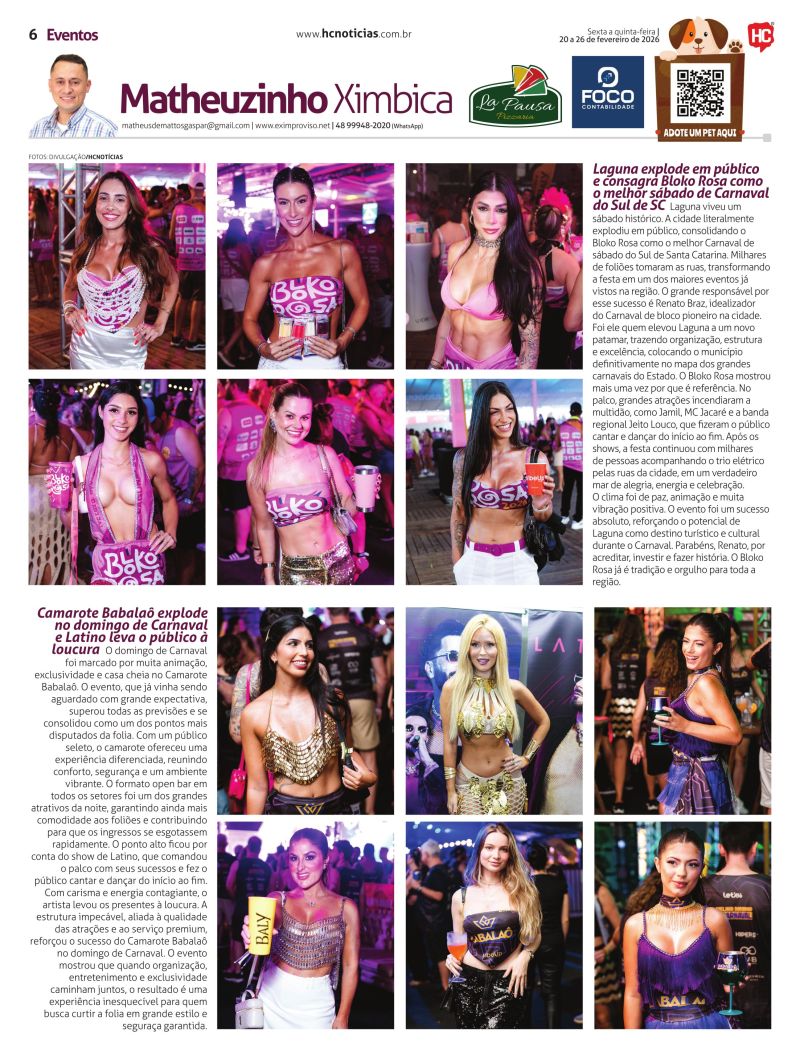 A partir do próximo sábado, Matheus Ximbica Gaspar também integra a equipe do HC Notícias. Ele escreverá sobre tudo o que acontece na área de entretenimento nas noites na região. Matheus foi pioneiro na noite em Tubarão com o portal eletrônico, quando iniciou em 2001. Hoje atua com o portal Eximproviso, onde chegou a 20 milhões de acessos, desde quando foi criado, em 2000. Junto também existe a revista de mesmo nome.