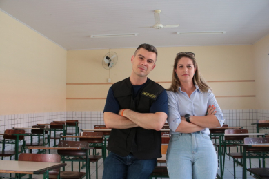 Ela é mãe da Sofia e do Pedro. A Sofia vai para o 4º ano e o Pedro para o 9º. Ela foi atrás de respostas e mobilizou lideranças para viabilizar o projeto para a reforma da rede elétrica. Cariny participou de reuniões com a direção da escola, com a Gered, e até mesmo com o secretário estadual de Educação em busca de soluções. Um abaixo-assinado foi feito e recolheu mais de 4 mil assinaturas. Ela chegou a pedir apoio do deputado estadual Bruno André Souza.