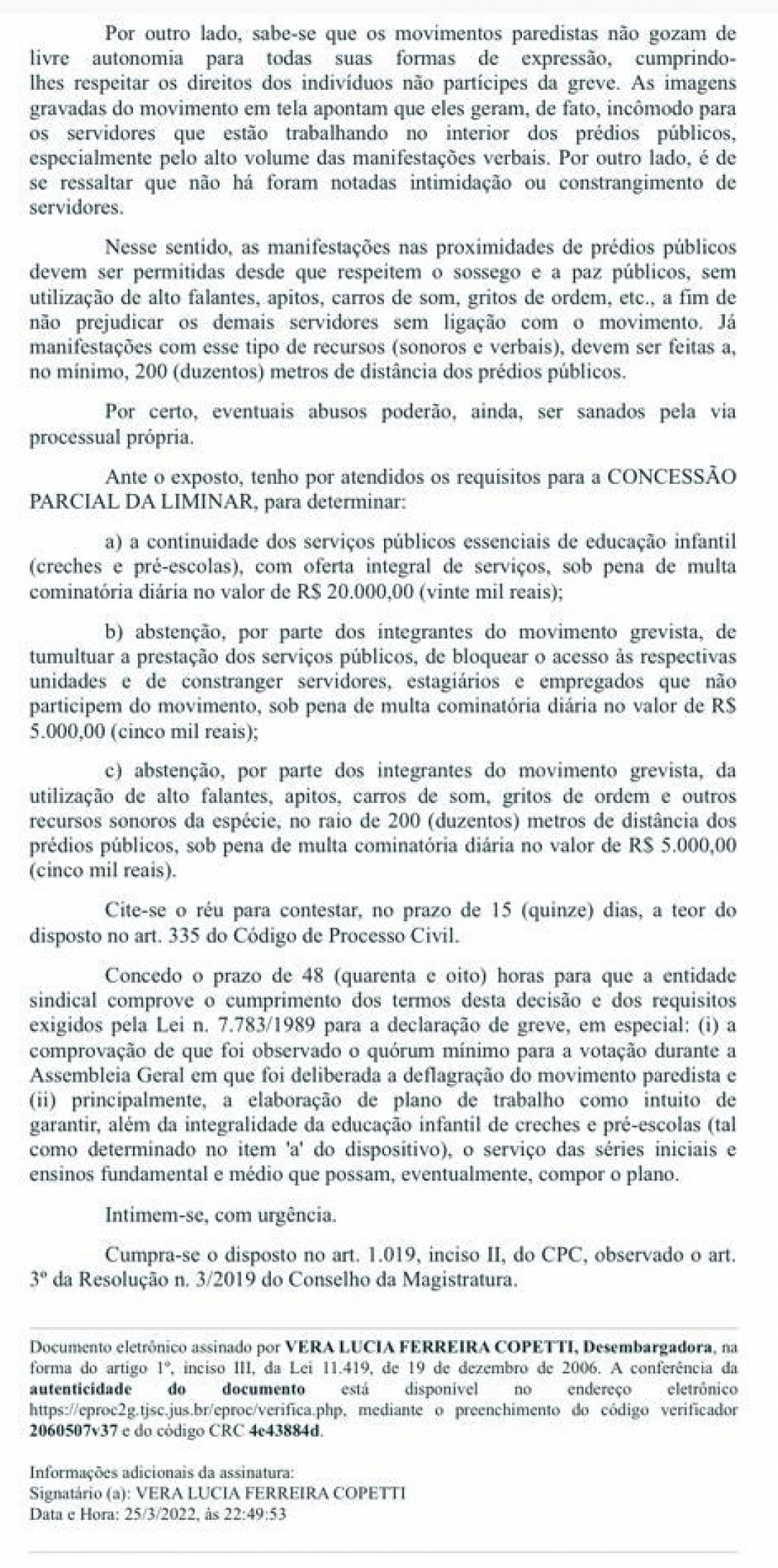 A desembargadora do Tribunal de Justiça de Santa Catarina (TJ-SC), Vera Lucia Ferreira Copetti, julgou, parcialmente, procedente a ação proposta pela Prefeitura de Capivari de Baixo contra o Sindicato dos Trabalhadores na Área da Educação da Rede Municipal de Tubarão e Capivari de Baixo (Sintermut).