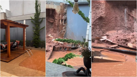 Está circulando pela web um vídeo que mostra o momento de tensão em que um muro desabou sobre a piscina de uma casa localizada no condomínio Alphaville, na Grande São Paulo. O registro foi feito pelo dono do imóvel e divulgado nas redes sociais na quinta-feira (26).