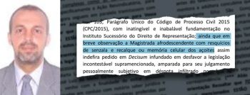 Em outro trecho, ele estende os ataques à magistrada dizendo: “Venho com a finalidade de evitar omissões fraudulentas tramadas em conluio com notório saber jurídico e seguidas de infundadas decisões prevaricadoras proferidas por bonecas admoestadas das filhas das Sinhás das casas de engenho”.