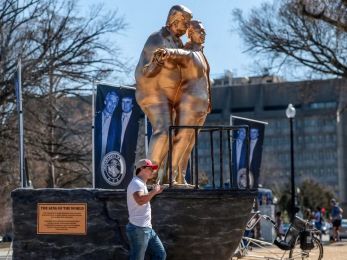 Placas colocadas ao lado da escultura fazem referência às possíveis ligações entre Trump e Epstein. A instalação também inclui uma fileira de grandes outdoors com a imagem dos dois homens juntos.