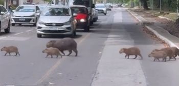 A gravação foi feita por Luiz Henrique Fogaça, que já flagrou outra família de capivaras atravessando no mesmo local em outubro do ano passado